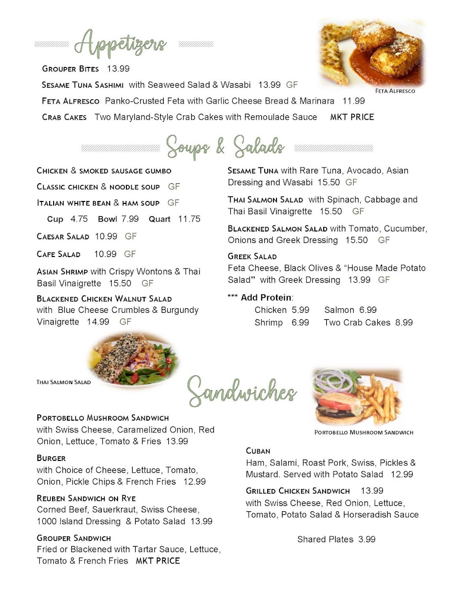 Welcome to Cafe Alfresco - Dunedin, a culinary gem situated at 344 Main St, Dunedin, FL. This delightful cafe boasts a diverse menu that caters to all palates, showcasing a blend of flavors and fresh ingredients. Begin your meal with enticing appetizers like the Feta Alfresco or the delectable Crab Cakes. For salad lovers, the Asian Shrimp Salad is a must-try, harmonizing crispy wontons and vibrant Thai basil vinaigrette.