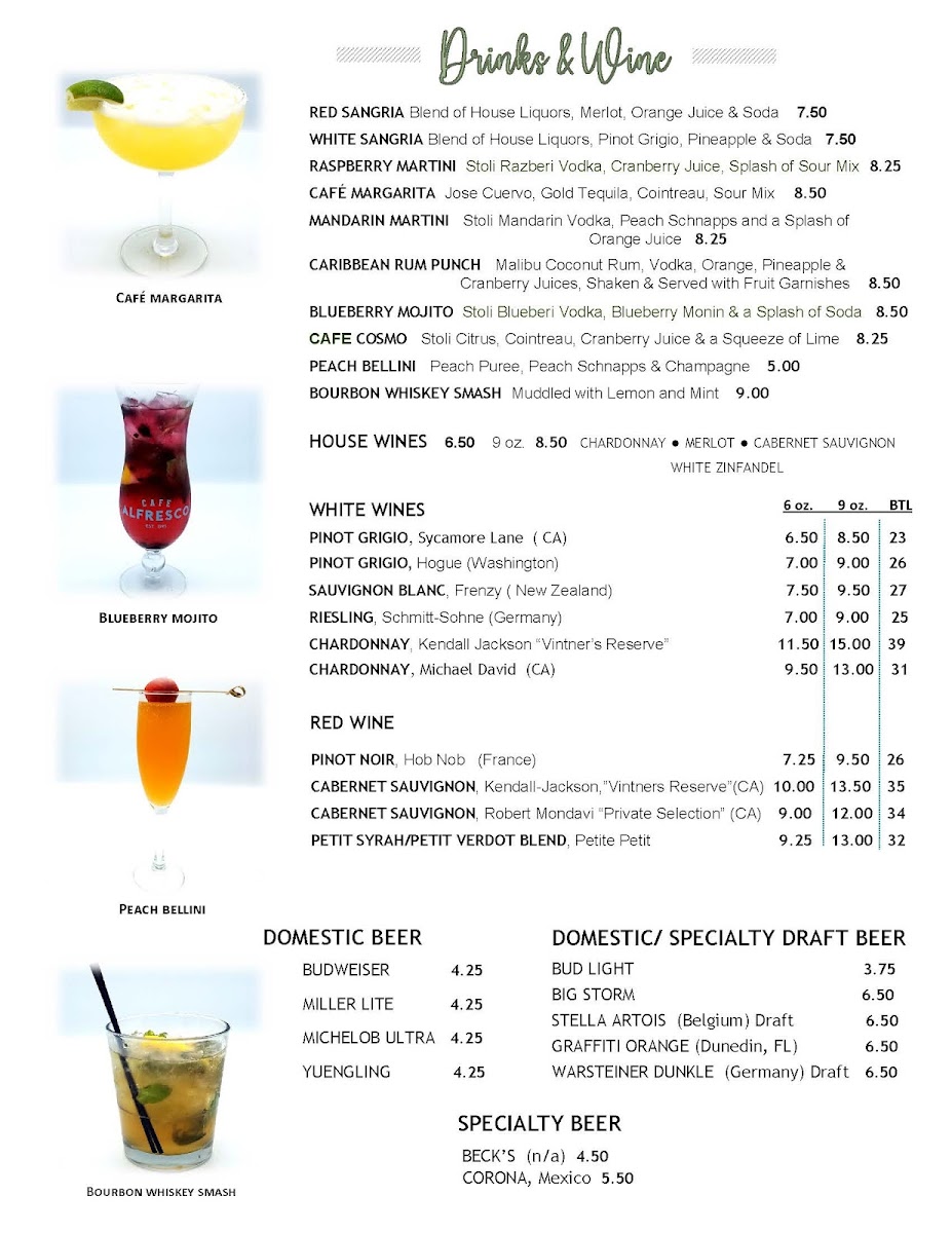 When it comes to entrees, options abound—from the savory Grouper prepared your way to the perfectly seared salmon. The Chicken Parmesan and Eggplant Parmesan deliver classic comfort with a twist. With prompt service and an inviting atmosphere, Cafe Alfresco promises not just a meal, but a dining experience that leaves you craving more. Be sure to savor their special cocktails like the famed blueberry mojito, making each visit unforgettable!